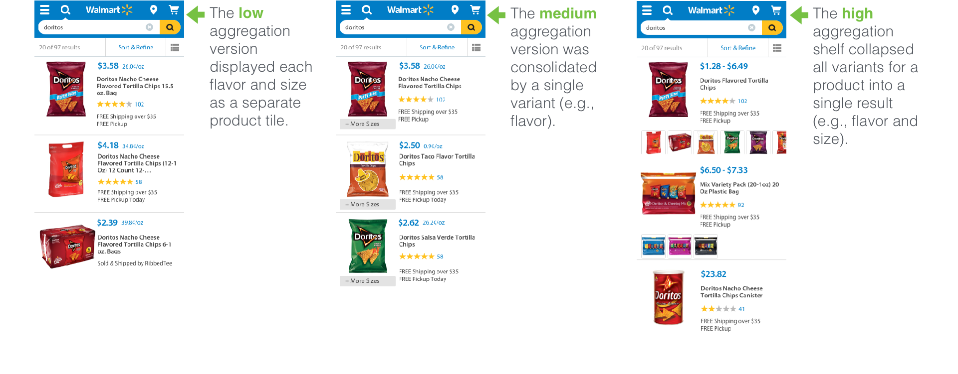 1. Customers want to see variants consolidated differently depending where they are in the shopping journey. Customers want to see products organized on the shelf page, but they want to see all possible product variations consolidated on a single item page.